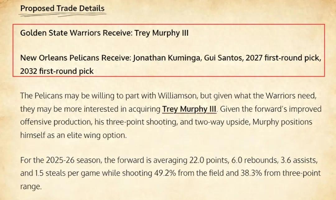 美媒《Fadeaway Wolrd》撰文建议,勇士应该将库明加、桑托斯、2027年以及2032年的首轮签送到鹈鹕,换回墨菲。